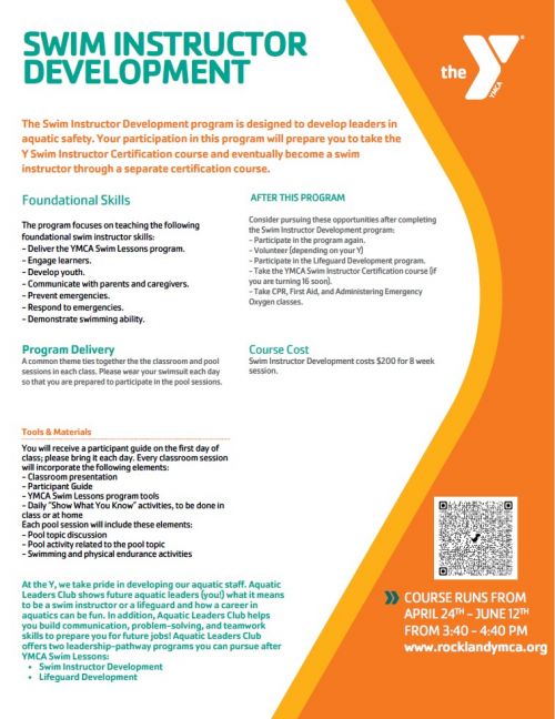 The Swim Instructor Development program is designed to develop leaders in aquatic safety. Your participation in this program will prepare you to take the Y Swim Instructor Certification course and eventually become a swim instructor through a separate certification course.